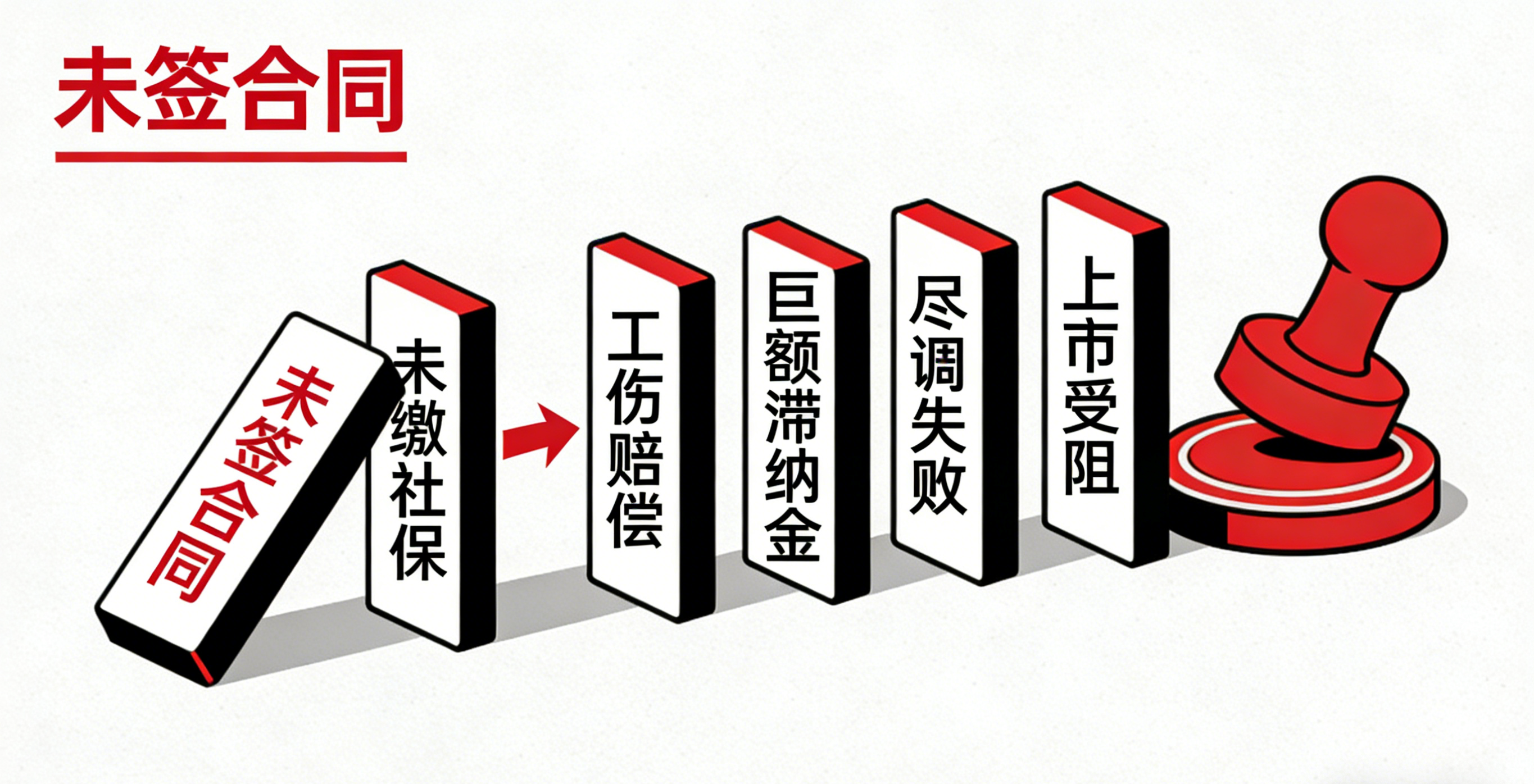 另一方面,对于有发展雄心的企业,劳动用工合规是投资方尽职调查和上市审核的核心关注点。若投资方或监管机构发现企业存在大量未签劳动合同的历史,会直接认定企业存在严重的内部控制缺陷。这可能导致三种后果:投资方大幅压低企业估值;要求在投资款中预留大额资金作为潜在纠纷准备金;企业上市进程受阻,多年努力付诸东流。