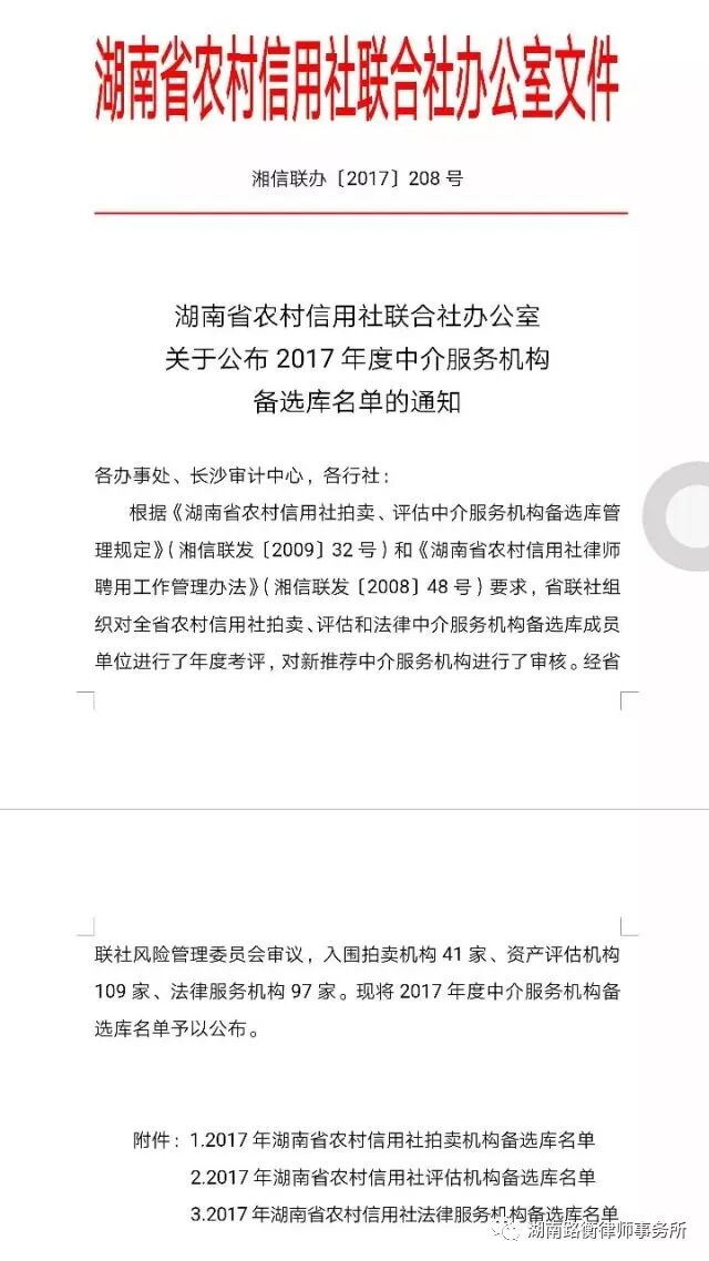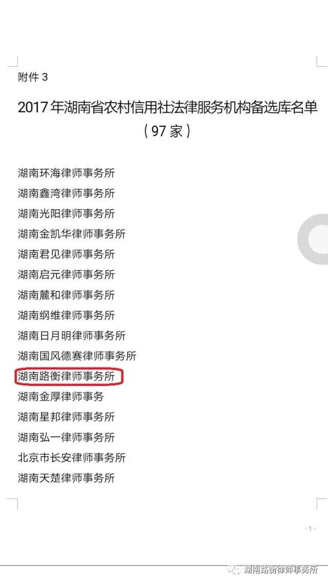 2017年10月25日,湖南省农村信用社公布2017年度法律服务机构备选库名单,其中长沙地区共入选13家,湖南路衡律师事务所作为其中之一成功入选。